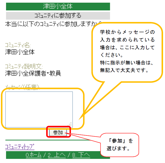 確認画面が表示されるので、必要であればメッセージを入力して「参加」をクリックします。