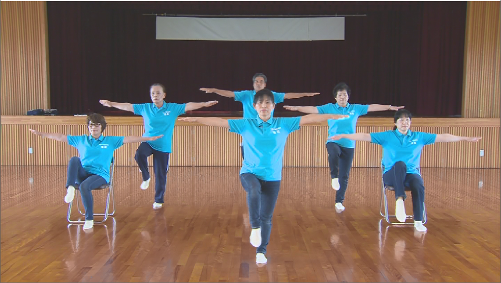 年齢を重ねることによって筋力が低下するロコモティブ・シンドロームを予防するため、「ふるさと」の曲に合わせて筋力アップの体操ができます。立つのがつらい方は座ったままで体操ができます。